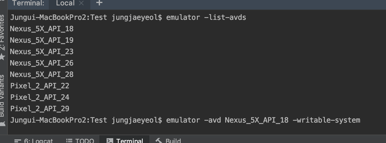 emulator -avd 이름 -writable-system 명령어로 에뮬레이터를 시스템 파일 쓰기 가능한 상태로 실행해준다