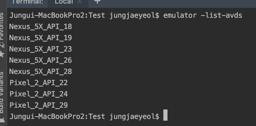 emulator -list-avds 명령어로 현재 생성되어 있는 Android Virtual Device 목록을 불러온다