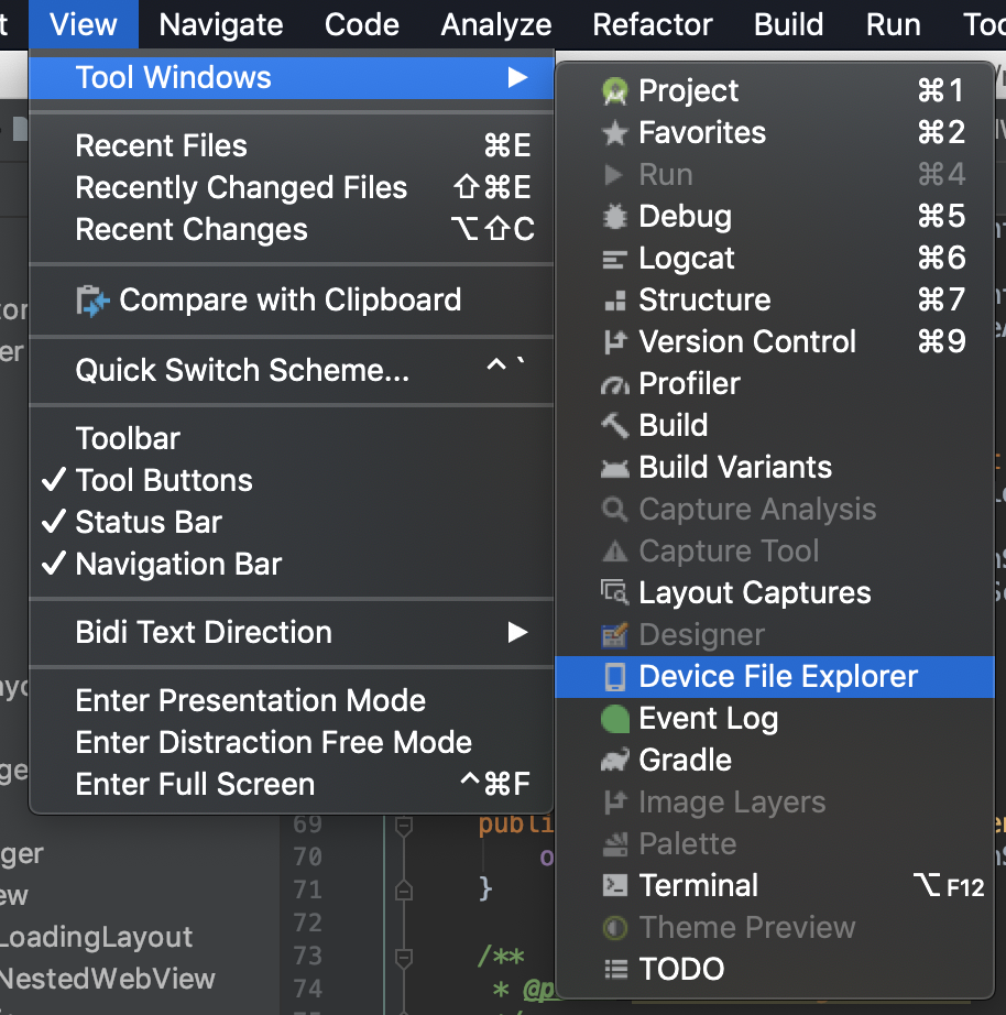 에뮬이 실행이 완료되면 안드로이드 스튜디오에서 View-Tool Windows-Device File Explorer를 선택해서 Device File Explorer를 실행해준다