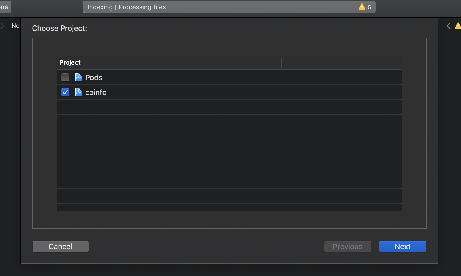 아직은 cocoapods가 남아있어서 해당 프로젝트만 선택한 후 Next 버튼을 눌러준다
