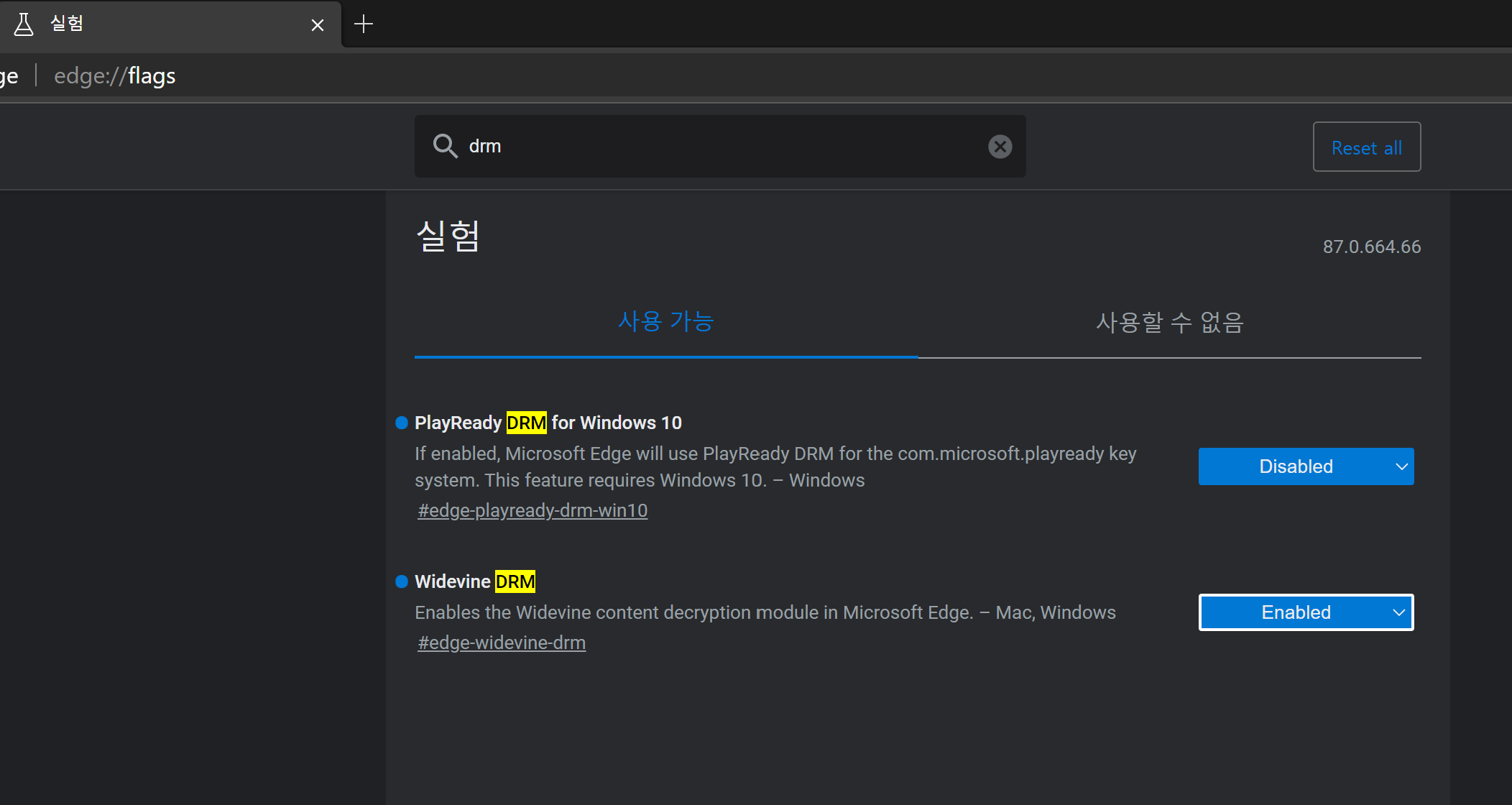 edge://flags에 들어가 DRM으로 검색하고 PlayReady DRM을 Disabled 시키고 Widevine DRM을 Enabled 시키고 Edge를 다시 시작하면 넷플릭스가 문제없이 재생된다